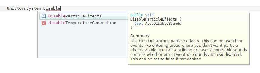 Once you have done the above, you will be able to see all of UniStorm's API. Here's an example: