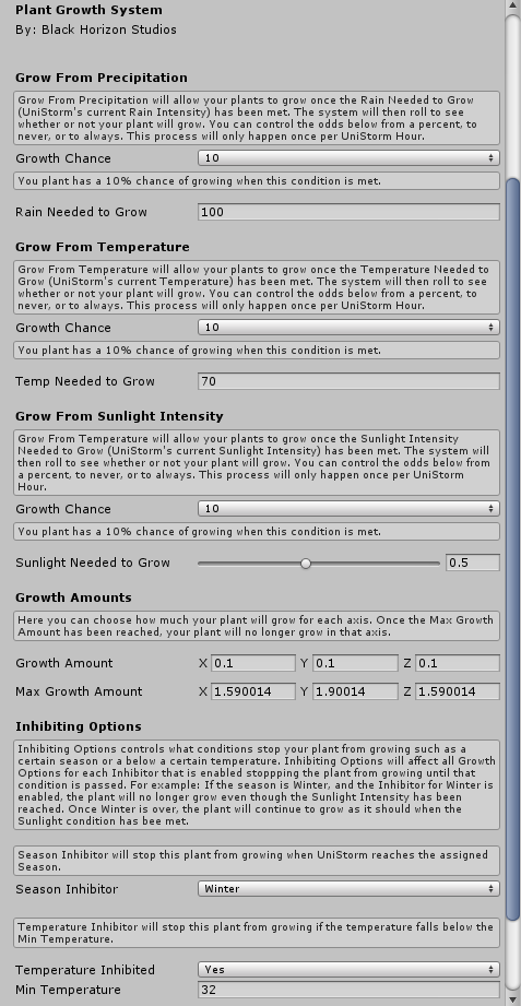 - Season Inhibitor - The Season Inhibitor will stop this plant from growing when UniStorm reaches the assigned Season. Your choices are Spring, Summer, Fall, and Winter.