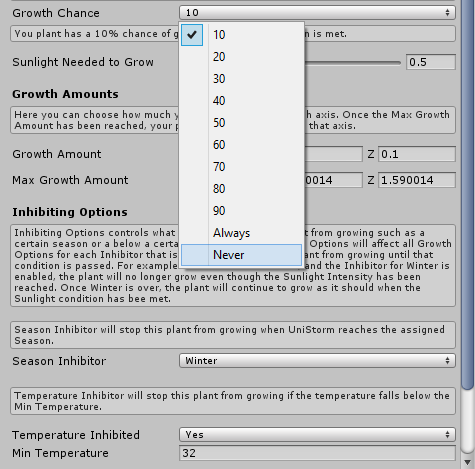 - Temperature - Growing from Temperature will allow your plants to grow once the Temperature Needed to Grow (UniStorm's current Temperature) has been met. The system will then roll to see whether or not your plant will grow. You can control the odds below from a percent, to never, or to always. This process will only happen once per UniStorm Hour.